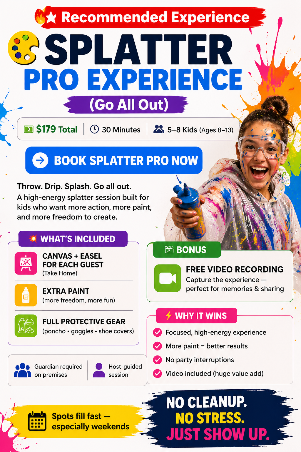 Throw. Drip. Splash. Go all out. A high-energy splatter session built for kids who want more action, more paint, and more freedom to create.